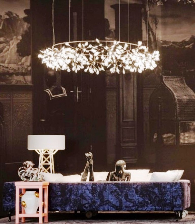 - В случае выбора интерьера со множеством текстур и деталей — дизайнеры рекомендуют подбирать люстру в тёплой цветовой гамме.