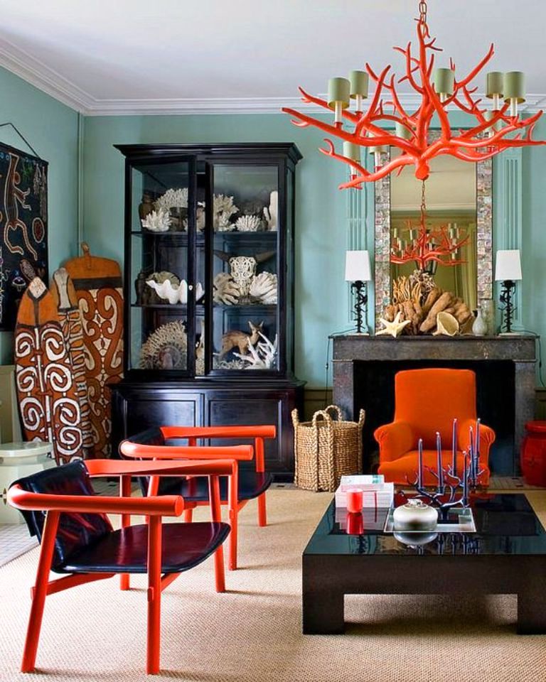 Оранжевый. Такая люстра- частый житель в детских или на кухне, хорошо сочетается с мебелью зелёного и синего цветов.