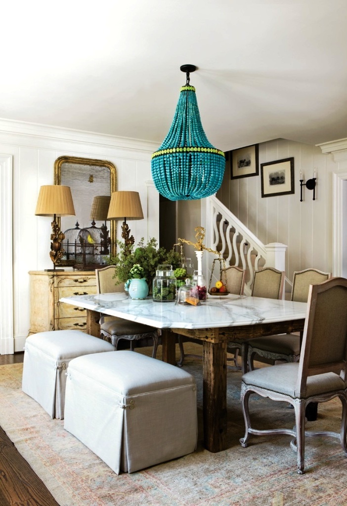 Бирюзовый, голубой, синий. Хорошо впишется в любой интерьер, где присутствует белый, серый, кофейный цвета. Светильники с подвесками бирюзового цвета довольно часто размещают на кухне, чтобы придать ей нарядности.