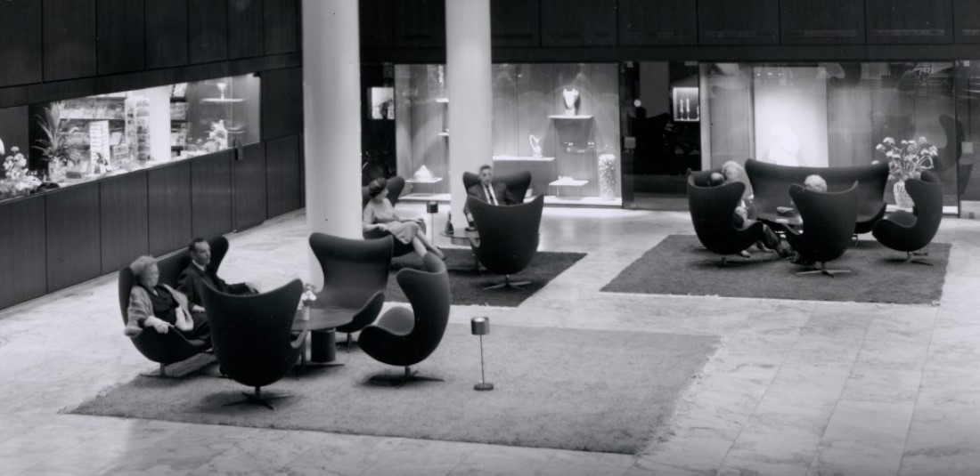 А все началось с того, что Арне Якобсен был приглашен для проектирования SAS Royal Hotel в Копенгагене, его подход к этой работе был комплексным: начиная с архитектурных планов и заканчивая столовыми приборами этого отеля. Разрабатывая дизайн холла, Арне Якобсен задумал немного изменить классическую интерпретацию общепринятого вида кресла, соединив спинку, сиденье и подлокотники в одну единую форму, избежав прямых углов.