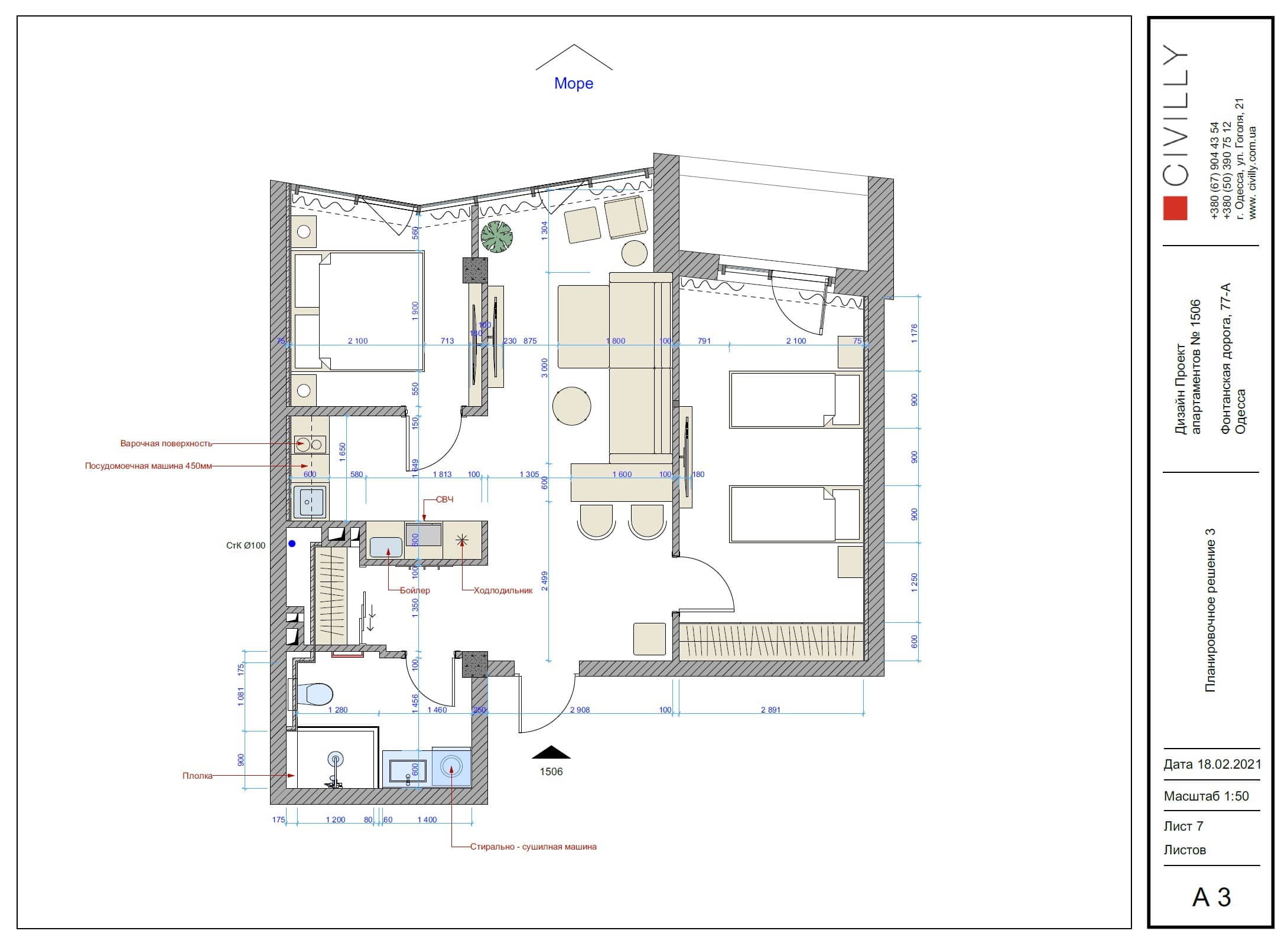 Планування цієї квартири розроблено для сім'ї з чотирьох осіб, яка приїжджає сюди на кілька місяців літа відпочити біля моря. Класичні "апартаменти для відпустки" і всі планувальні рішення мають бути підпорядковані такому цільовому призначенню.