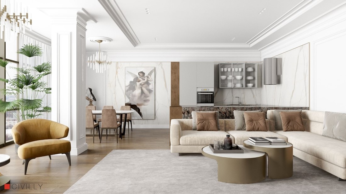 Почнемо ми, мабуть, з вітальні. Це місце, де господарі приймають гостей. Все виконано у світлих тонах, як і диктує нам обрана концепція, стіни та стеля прикрашені гіпсовими молдингами та карнизами, але не занадто химерно, без надмірностей. В інтер'єрі немає занадто яскравих кольорових акцентів, замість них ми бачимо — глибокі гірчичні та коричневі кольори. Тут зручно розміститися як за обіднім столом, так і на дивані, достатньо місця для прийому гостей. Стіни на кухні оздоблені широкоформатною плиткою, що імітує білий мармур, вони продовжуються і з боку обіднього столу. Вдень у цій зоні багато світла, а ввечері можна спостерігати за вогнями міста. Таку можливість нам дають панорамні вікна. Зона відпочинку та стіна за телевізором не навантажені елементами декору. Архітектор залишив там лише консольну тумбу та полиці в стіні: для книг або важливих дрібниць.