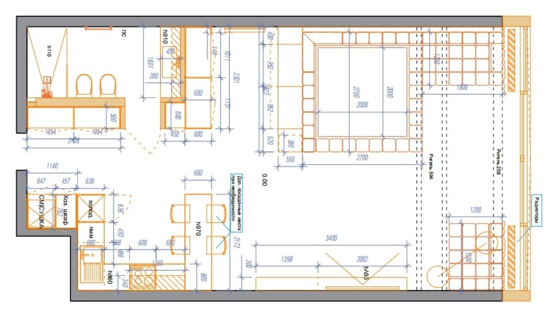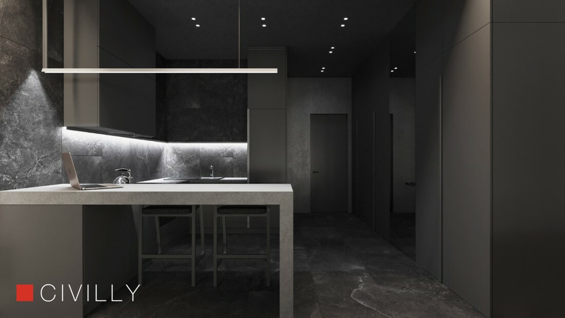 Простір був візуально зонований за природними структурами. Вхідна група меблів імітує кам'яні елементи, і як продовження, кухня та санвузол виконані в одній кольоровій гамі.