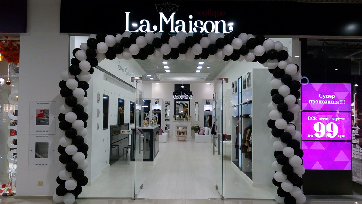 Проєкт «під ключ» для La Maison: дизайн інтер'єру, будівельно-оздоблювальні роботи та виготовлення меблів. Від ідеї до відкриття — 1,5 місяці. Образ бутика — елегантна класика з гламурними акцентами: симетрія, глянець, дзеркальні та скляні поверхні, м'яке підсвічування вітрин.